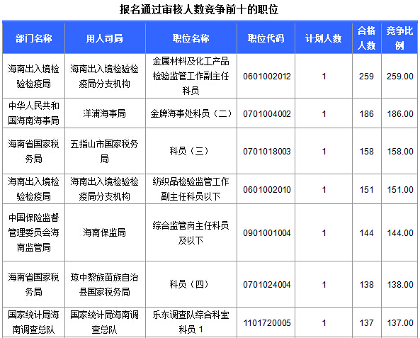 報(bào)名通過審核人數(shù)前十的職位主要集中在海南出入境檢驗(yàn)檢疫局、海南省國(guó)家稅務(wù)局、中華人民共和國(guó)海南海事局等部門,具體信息如下: