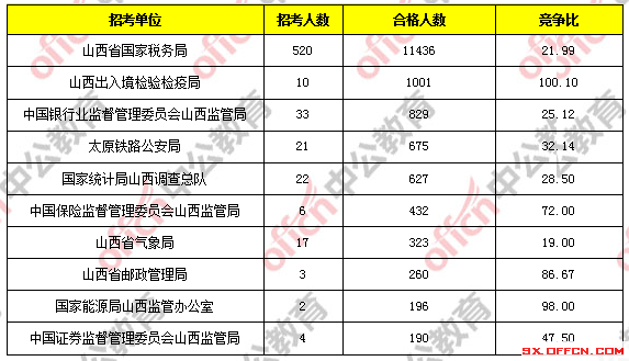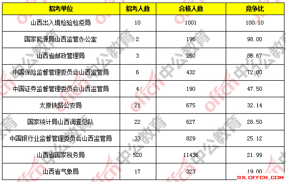為幫助廣大考生更清晰的了解今日報名情況,山西中公網(wǎng)校整理了合格人數(shù)前十位的部門以及競爭比例最激烈的十大部門,供廣大考生參考: