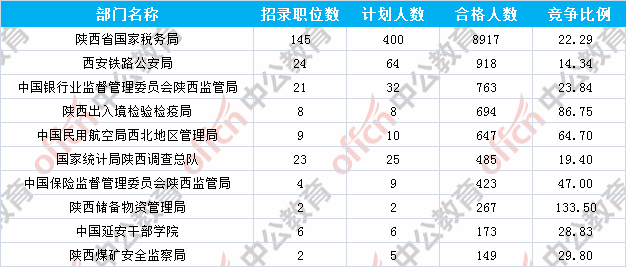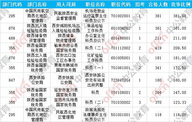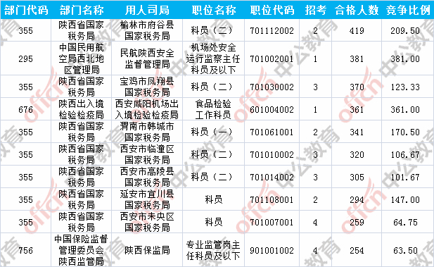 報(bào)名通過(guò)審核人數(shù)前十的職位主要集中在陜西出入境檢驗(yàn)檢疫局、陜西省國(guó)家稅務(wù)局、中國(guó)民用航空局西北地區(qū)管理局等部門(mén),具體信息如下:
