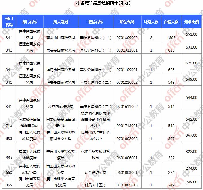為幫助廣大考生更清晰的了解今日報名情況,福建中公網(wǎng)校整理了審核通過人數(shù)前10位的部門以及競爭比例最激烈的10大部門,供廣大考生參考: