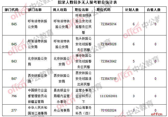 截止到22日8時,仍有546個崗位報考人數(shù)還未破零,占3.5%,依然呈現(xiàn)出冰火兩重天的奇特景象。中央黨群機關參照公務員法管理人民團體和群眾團體和中央黨群機關參照公務員法管理事業(yè)單位這兩個系統(tǒng)所有職位均已破零。國家公務員局官方發(fā)布《關于報考人數(shù)較少職位情況的特別提醒》呼吁考生結合職位特點和自身條件,理性選擇報考職位。為了讓考生關注那些在報名中“遇冷”的職位,國家公務員局還匯總整理了目前無人通過資格審查職位和資格審查合格人數(shù)比例較低職位(小于3:1)的相關信息,并在官網上公布,中公教育專家在此將幾個招錄人數(shù)較多的幾個“遇冷”職位進行統(tǒng)計,希望考生們“垂青”。