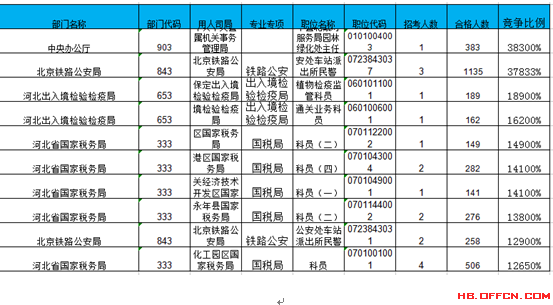 報名通過審核人數(shù)前十的職位主要集中在北京鐵路公安局、河北省國家稅務(wù)局、中央辦公廳等部門,具體信息如下: