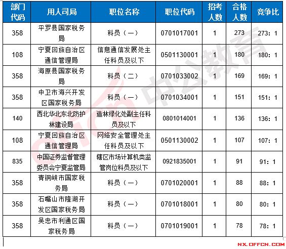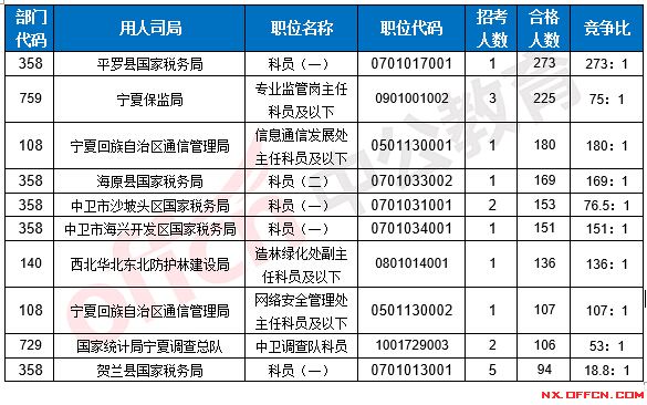 截至22日8時,據(jù)寧夏中公教育統(tǒng)計(jì),2017國考招錄職位中工作地點(diǎn)在寧夏的職位審核合格總?cè)藬?shù)為4549人,所有職位均有人報(bào)考,其中6職位競爭比低于面試比例,平均競爭比例為28.8:1 。