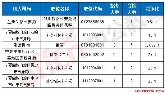 截止到22日8時,工作地點(diǎn)在寧夏的職位均有人報(bào)考,其中6職位競爭比低于面試比例。下面是爭比例低于面試比例職位一覽表,中公教育專家建議廣大考生多關(guān)注一些較冷職位,避免激烈競爭,結(jié)合自身?xiàng)l件,找到屬于自己的職位。