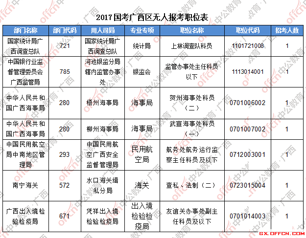 截止到22日16時(shí),工作地點(diǎn)在廣西的職位共有7個(gè)無(wú)人報(bào)考,僅占全部職位的1%。下面是部分廣西無(wú)人報(bào)考職位一覽表,廣西中公教育專家建議廣大考生結(jié)合自身?xiàng)l件,根據(jù)自己的實(shí)際情況找到屬于自己的職位,避免激烈競(jìng)爭(zhēng)。