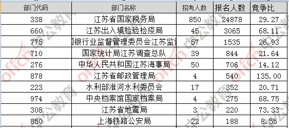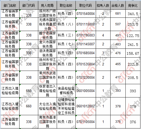 報(bào)名通過審核人數(shù)前十的職位主要集中在江蘇省國家稅務(wù)局、江蘇出入境檢驗(yàn)檢疫局,具體信息如下: