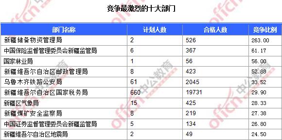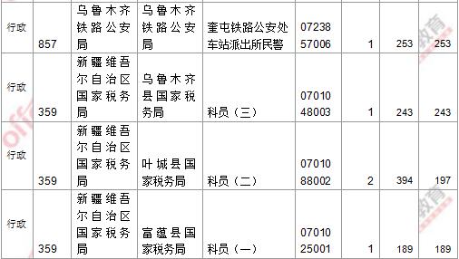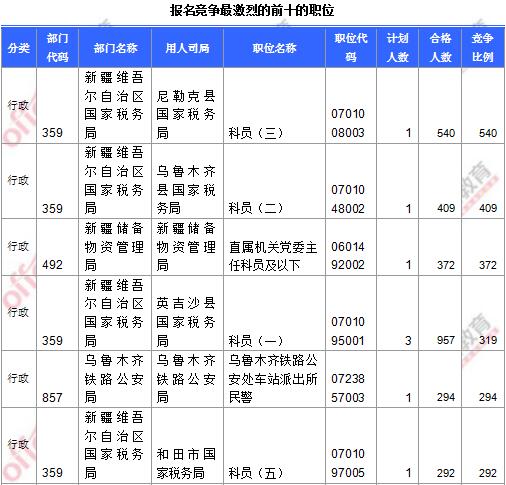 報(bào)名通過(guò)審核人數(shù)前十的職位主要集中在新疆維吾爾自治區(qū)國(guó)家稅務(wù)局、新疆儲(chǔ)備物資管理局、烏魯木齊鐵路公安局部門(mén),具體信息如下: