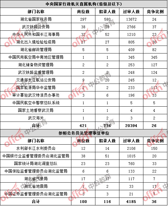 截止到22日16時(shí),通過(guò)審核人數(shù)前三位的部門(mén)仍然是:湖北省國(guó)家稅務(wù)局、武漢鐵路公安局、水利部長(zhǎng)江水利委員會(huì),三部門(mén)通過(guò)審核總?cè)藬?shù)達(dá)18544人,占通過(guò)審核總?cè)藬?shù)的75.45%,各部門(mén)招錄情況如下:
