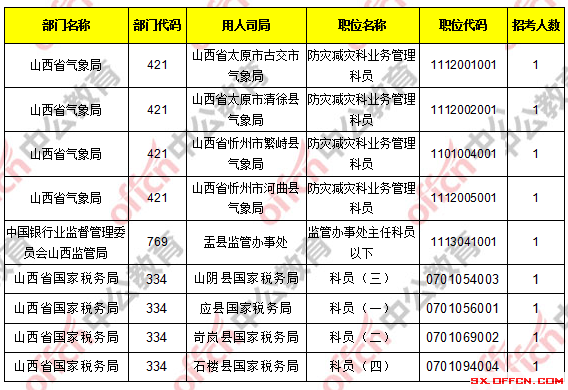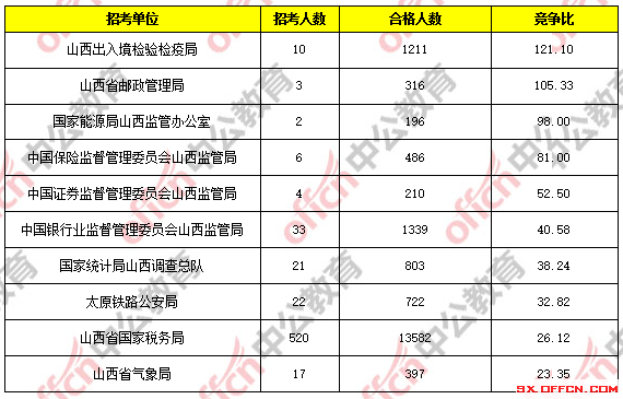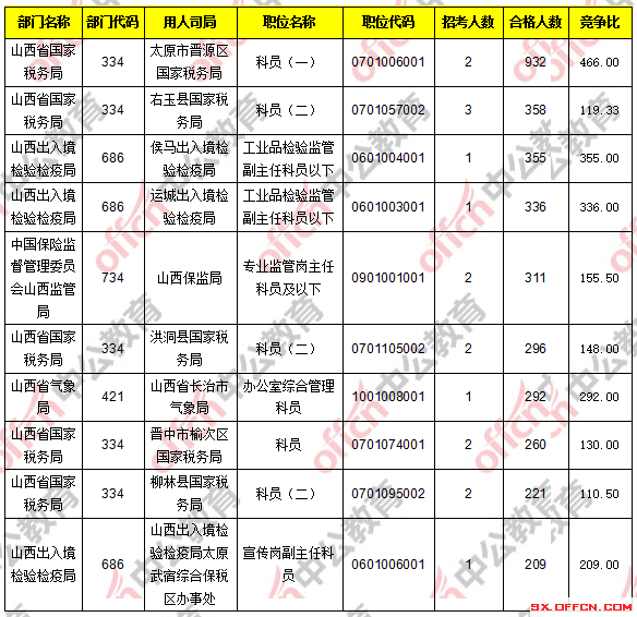 報(bào)考人數(shù)前十的職位主要集中在山西省國(guó)家稅務(wù)局、山西出入境檢驗(yàn)檢疫局這兩個(gè)部門,具體信息如下: