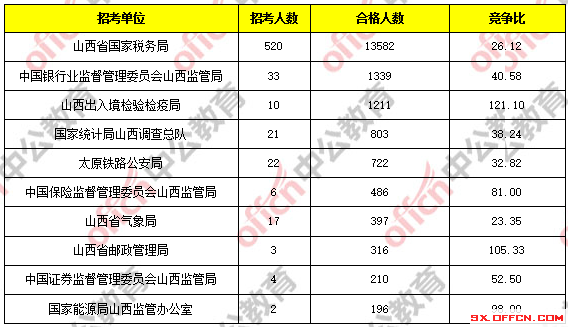為幫助廣大考生更清晰的了解今日?qǐng)?bào)名情況,山西中公教育整理了合格人數(shù)前十位的部門以及競(jìng)爭(zhēng)比例最激烈的十大部門,供廣大考生參考: