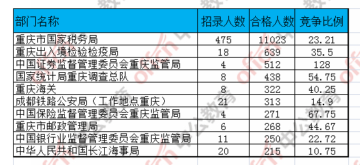 為幫助廣大考生更清晰的了解今日報(bào)名情況,重慶中公教育整理了審核通過人數(shù)前十位的部門以及競爭比例最激烈的十大部門,供廣大考生參考: