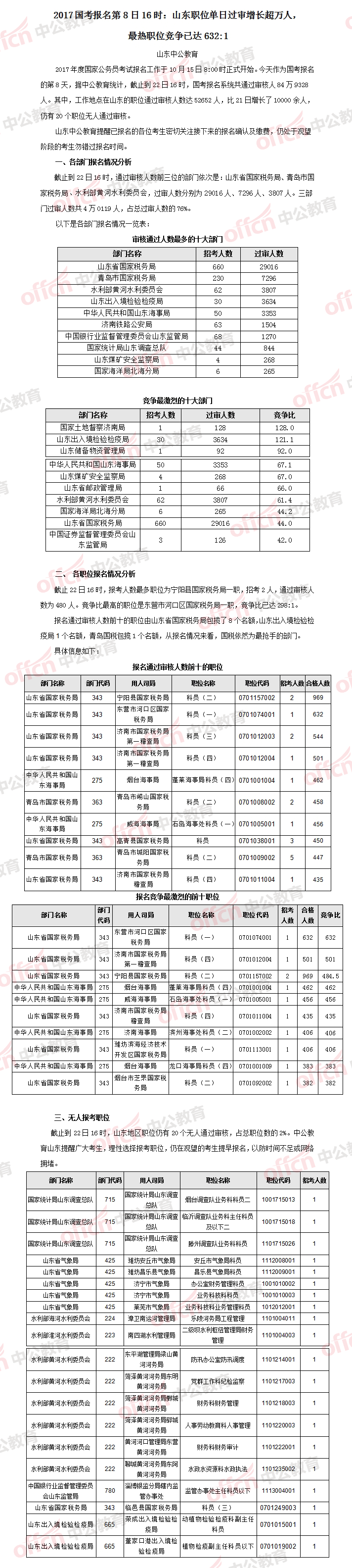 【截至22日16時】2017國考報名山東職位單日過審增長超萬人, 最熱職位競爭已達632:1