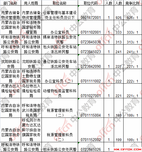 報(bào)名通過審核人數(shù)前十的職位主要集中在內(nèi)蒙古儲備物資管理局、內(nèi)蒙古土默特右旗國家稅務(wù)局、內(nèi)蒙古固陽縣國家稅務(wù)局等部門,具體信息如下: