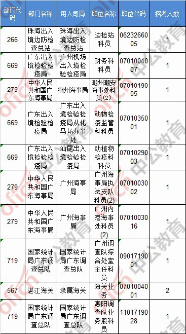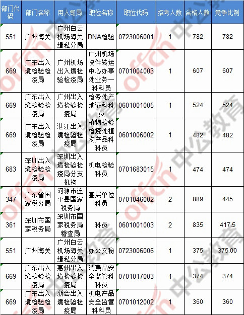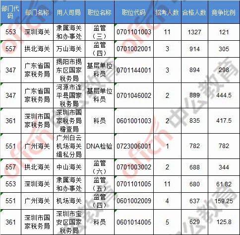 報(bào)名通過審核人數(shù)前十的職位主要集中在深圳海關(guān)、拱北海關(guān)、廣東省國(guó)家稅務(wù)局,具體信息如下: