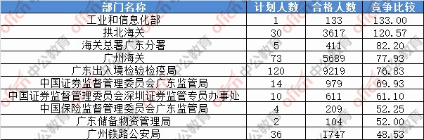 為幫助廣大考生更清晰的了解今日?qǐng)?bào)名情況,廣東中公網(wǎng)校整理了審核通過人數(shù)前十位的部門以及競(jìng)爭(zhēng)比例最激烈的十大部門,供廣大考生參考: