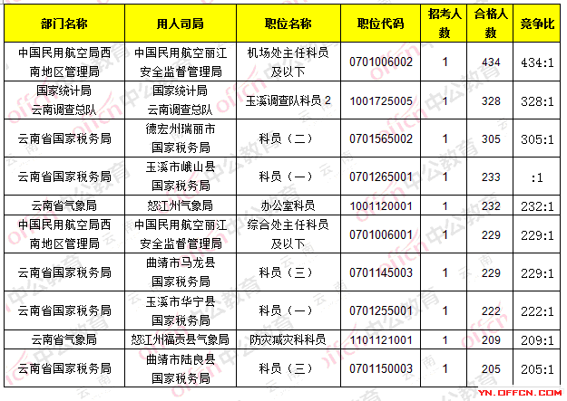 截止23日8時,招錄比例的職位為中國民用航空麗江安全監(jiān)督管理局_機(jī)場處主任科員及以下,職位代碼是0701006002,招錄1人,通過人數(shù)434人,競爭比434:1