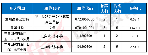 截止到23日16時(shí),工作地點(diǎn)在寧夏的職位均有人報(bào)考,其中4職位競(jìng)爭(zhēng)比低于面試比例。下面是爭(zhēng)比例低于面試比例職位一覽表,中公網(wǎng)校專家建議廣大考生多關(guān)注一些較冷職位,避免激烈競(jìng)爭(zhēng),結(jié)合自身?xiàng)l件,找到屬于自己的職位。