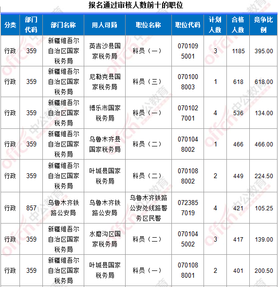 報(bào)名通過(guò)審核人數(shù)前十的職位主要集中在新疆維吾爾自治區(qū)國(guó)家稅務(wù)局、新疆儲(chǔ)備物資管理局、烏魯木齊鐵路公安局部門(mén),具體信息如下: