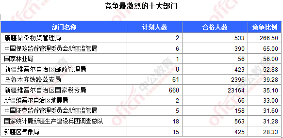 為幫助廣大考生更清晰的了解今日?qǐng)?bào)名情況,新疆中公網(wǎng)校整理了審核通過(guò)人數(shù)前十位的部門(mén)以及競(jìng)爭(zhēng)比例最激烈的十大部門(mén),供廣大考生參考: