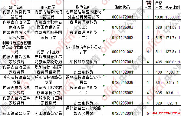 報名通過審核人數(shù)前十的職位主要集中在內(nèi)蒙古儲備物資管理局、內(nèi)蒙古土默特右旗國家稅務(wù)局、內(nèi)蒙古固陽縣國家稅務(wù)局等部門,具體信息如下: