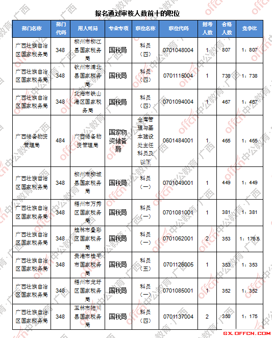報名通過審核人數前十的職位主要集中在廣西壯族自治區(qū)國家稅務局、廣西儲備物資管理局等部門,具體信息如下: