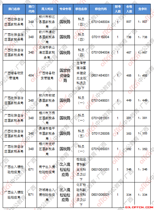 截止到24日8時,競爭比例的職位為柳州市柳江縣國家稅務局科員(四)一職,招錄1人,通過人數為807人,競爭比例807:1。