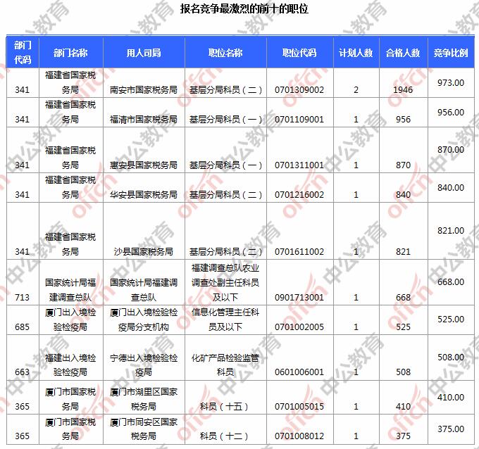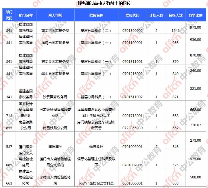 報(bào)名通過審核人數(shù)前十的職位主要集中在南安市國家稅務(wù)局、福清市國家稅務(wù)局、惠安縣國家稅務(wù)局等部門,具體信息如下: