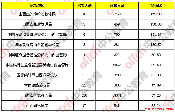 報考人數(shù)前十的職位主要集中在山西省國家稅務(wù)局、山西出入境檢驗檢疫局這兩個部門,具體信息如下: