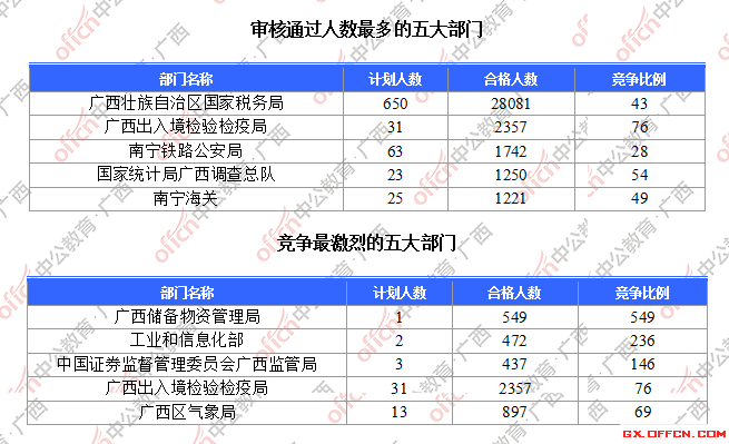 為幫助廣大考生更清晰的了解2017國(guó)考報(bào)名情況,廣西中公網(wǎng)校整理了審核通過(guò)人數(shù)前五位的部門以及競(jìng)爭(zhēng)比例最激烈的五大部門,供廣大考生參考: