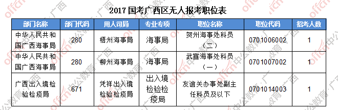 截止到24日17時(shí)30分,工作地點(diǎn)在廣西的職位共有3個(gè)無(wú)人報(bào)考,僅占全部職位的0.46%。下面是部分廣西無(wú)人報(bào)考職位一覽表。