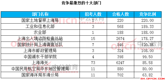 為幫助廣大考生更清晰的了解今日報名情況,上海中公網(wǎng)校整理了審核通過人數(shù)前十位的部門以及競爭比例最激烈的十大部門,供廣大考生參考: