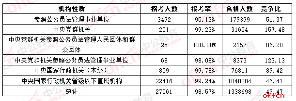 從五大系統(tǒng)分析,僅有中央黨群機(jī)關(guān)參照公務(wù)員法管理人民團(tuán)體和群眾團(tuán)體博考慮達(dá)到百分之百,中央黨群機(jī)關(guān)、中央黨群機(jī)關(guān)參照公務(wù)員法管理事業(yè)單位和中央國家行政機(jī)關(guān)(本級(jí))這三個(gè)系統(tǒng)均留下一個(gè)“老大難”職位,其中,中央黨群機(jī)關(guān)參照公務(wù)員法管理事業(yè)單位和中央黨群機(jī)關(guān)兩個(gè)系統(tǒng)的競(jìng)爭(zhēng)比例超過了100:1,分別為123.13、157.48,可見中央黨群是考生偏愛的對(duì)象。