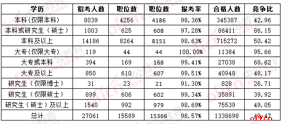 從各學(xué)歷報(bào)考情況來看,要求大專(僅限大專)學(xué)歷的職位的報(bào)考率達(dá)到了100%,要求為大專或本科學(xué)歷的共計(jì)169個(gè)職位,僅剩1個(gè)職位無人報(bào)考。競(jìng)爭(zhēng)比的是要求大專(僅限大專)的職位,競(jìng)爭(zhēng)比高達(dá)95.66:1,基本上接近百里挑一。學(xué)歷要求越高競(jìng)爭(zhēng)比越低,要求博士研究生學(xué)歷的職位競(jìng)爭(zhēng)比最低,僅為26.7:1。