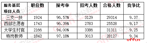 總體來看,要求四項(xiàng)目人員的職位報(bào)考率都很高,除了大學(xué)生村官職位低于95%以外剩下的均在95%以上,且四項(xiàng)目人員職位競(jìng)爭(zhēng)比較低,均在9:1左右。