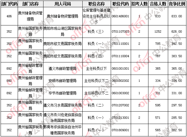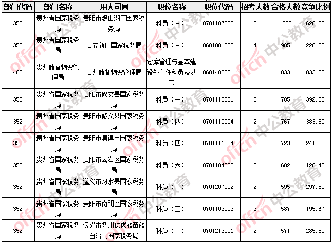 報(bào)名通過審核人數(shù)較多的職位主要集中在貴州省國(guó)家稅務(wù)局、貴州儲(chǔ)備物資管理局兩大部門,具體信息如下:
