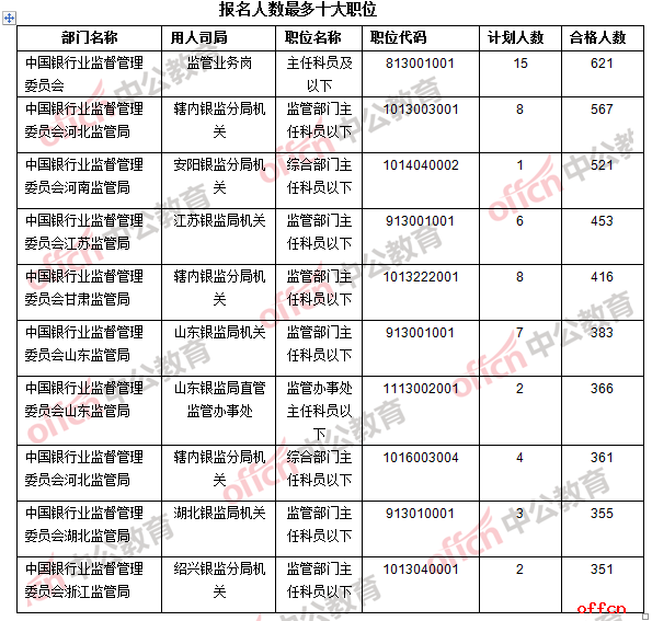 2017國考銀監(jiān)會36個部門共提供738個職位,招錄1178人。截至24日17:30,總報名審核通過人數(shù)為43066人,競爭比例為36.5:1,仍有19個職位無人報考,其余所有職位均有人通過審核。下面是中公網(wǎng)校統(tǒng)計的銀監(jiān)會報名情況,供考生參考: