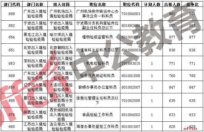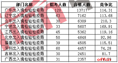 2017國考出入境檢驗檢疫系統(tǒng)32個部門共提供759個職位,招錄899人。截至24日17:30,總報名審核通過人數(shù)為81694人,競爭比例為90.87:1,仍有39個職位無人報考,其余所有職位均有人通過審核。下面是中公網(wǎng)校統(tǒng)計的出入境檢驗檢疫系統(tǒng)報名情況,供考生參考: