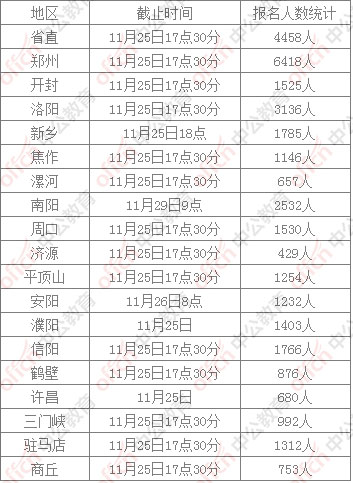 2016年河南省公務(wù)員考試自11月25日拉開(kāi)報(bào)考序幕,本次省考招錄人數(shù)為6123人,為了方便各位考生減少不必要的競(jìng)爭(zhēng),選擇最符合自身?xiàng)l件的崗位進(jìn)行報(bào)考,中公網(wǎng)校對(duì)各地區(qū)報(bào)名人數(shù)進(jìn)行了統(tǒng)計(jì),截止11月25日下午17點(diǎn)30分,河南省公務(wù)員各地區(qū)考試報(bào)名人數(shù)情況如下: