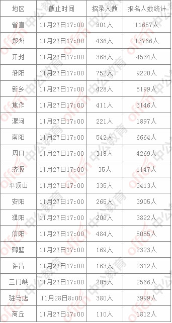 中公教育還就各地區(qū)的各崗位具體報名人數(shù)進行了統(tǒng)計分析,截至11月27日,河南省考部分地區(qū)崗位的具體報名情況如下: