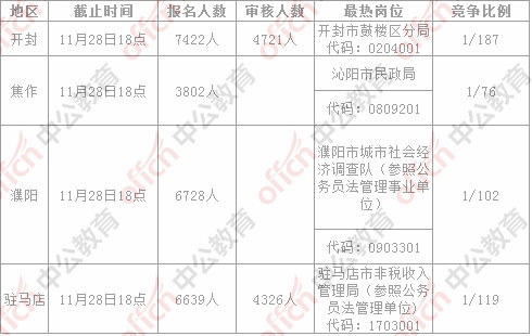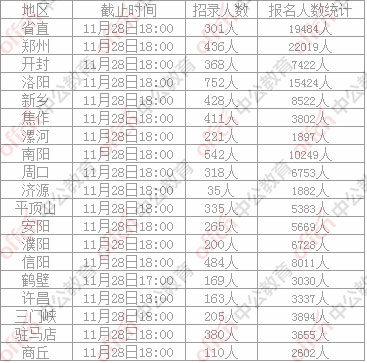 中公教育還就各地區(qū)的各崗位具體報(bào)名人數(shù)進(jìn)行了統(tǒng)計(jì)分析,截至11月28日,河南省考部分地區(qū)崗位的具體報(bào)名情況如下: