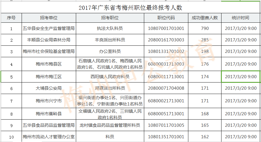 2017廣東省考各職位最終報名人數【梅州考區(qū)】,總計17200人報考,最熱職位比例1:790