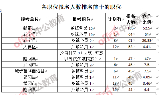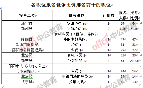 競爭熱門職位,前三位依次是:新寧縣鄉(xiāng)鎮(zhèn)科員10(競爭比例64:1)、新邵縣鄉(xiāng)鎮(zhèn)科員15(競爭比例52.5:1)和隆回縣 鄉(xiāng)鎮(zhèn)科員9(回族、瑤族以外的少數(shù)民族)(競爭比例47:1)。