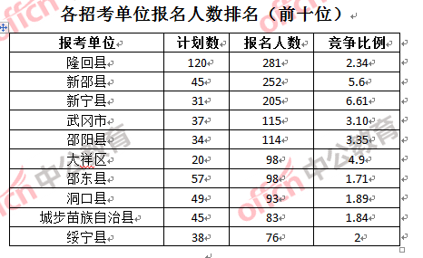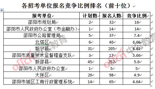 為幫助廣大考生更清晰的了解報名情況,中公教育整理了邵陽各招考單位的報名人數(shù)排名以及競爭比例排名,供廣大考生參考:
