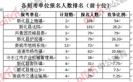 為幫助廣大考生更清晰的了解報名情況,中公教育整理了婁底市各招考單位的報名人數(shù)排名以及競爭比例排名,供廣大考生參考: