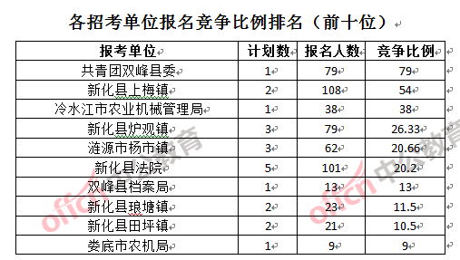 競爭熱門招考單位,前三位依次是:共青團雙峰縣委(競爭比例79:1)、新化縣上梅鎮(zhèn)(競爭比例54:1)和冷水江市農業(yè)機械管理局(競爭比例38:1)。