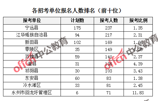 為幫助廣大考生更清晰的了解報(bào)名情況,中公教育整理了永州市各招考單位的報(bào)名人數(shù)排名以及競(jìng)爭比例排名,供廣大考生參考: