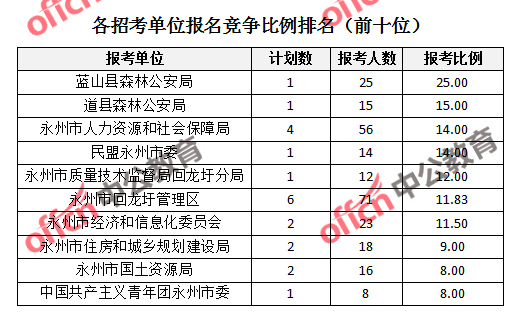 競(jìng)爭熱門招考單位,前三位依次是:藍(lán)山縣森林公安局(競(jìng)爭比例25:1)、道縣森林公安局(競(jìng)爭比例15:1)和永州市人力資源和社會(huì)局(競(jìng)爭比例14:1)、民盟永州市委(競(jìng)爭比例14:1)。