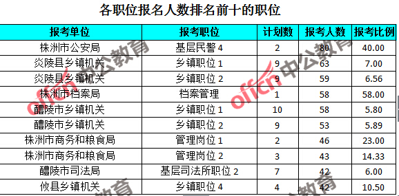 競爭熱門職位,前三位依次是:株洲市檔案局檔案管理(競爭比例58:1)、株洲市公安局基層民警4(競爭比例40:1)和醴陵市公安局民警2(競爭比例34:1)。