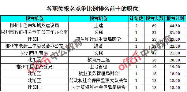 為幫助廣大考生更清晰的了解報名情況,中公教育整理了湖南郴州各職位的報名人數(shù)排名以及競爭比例排名,供廣大考生參考: