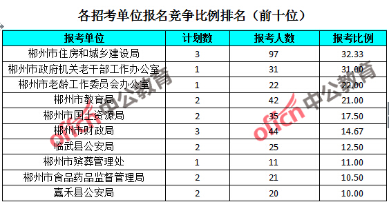 競爭熱門招考單位,前三位依次是:郴州市住房和城鄉(xiāng)建設(shè)局(競爭比例32.33:1)、郴州市政府機(jī)關(guān)老干部工作辦公室(競爭比例31:1)和郴州市老齡工作委員會辦公室(競爭比例22:1)。